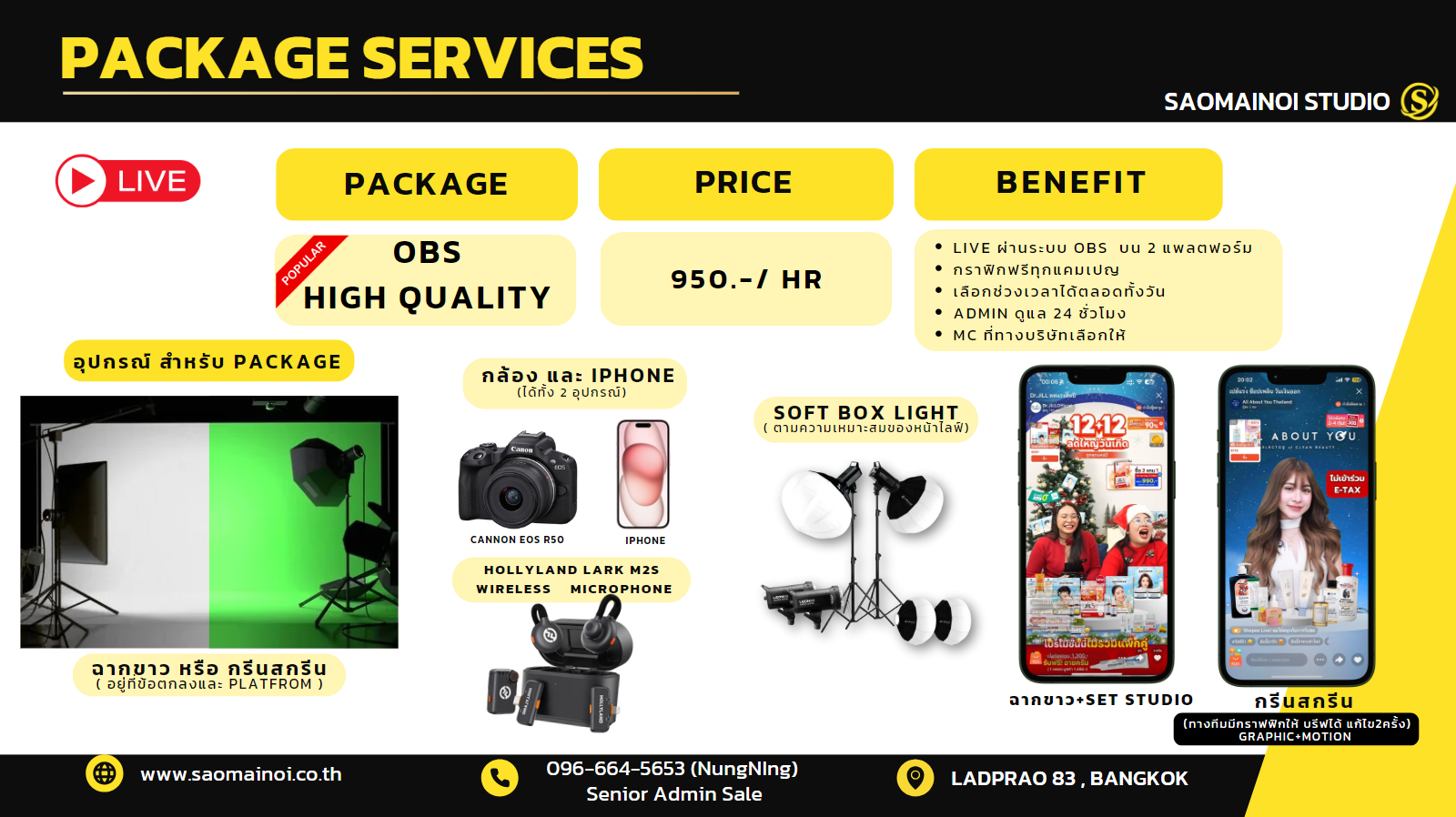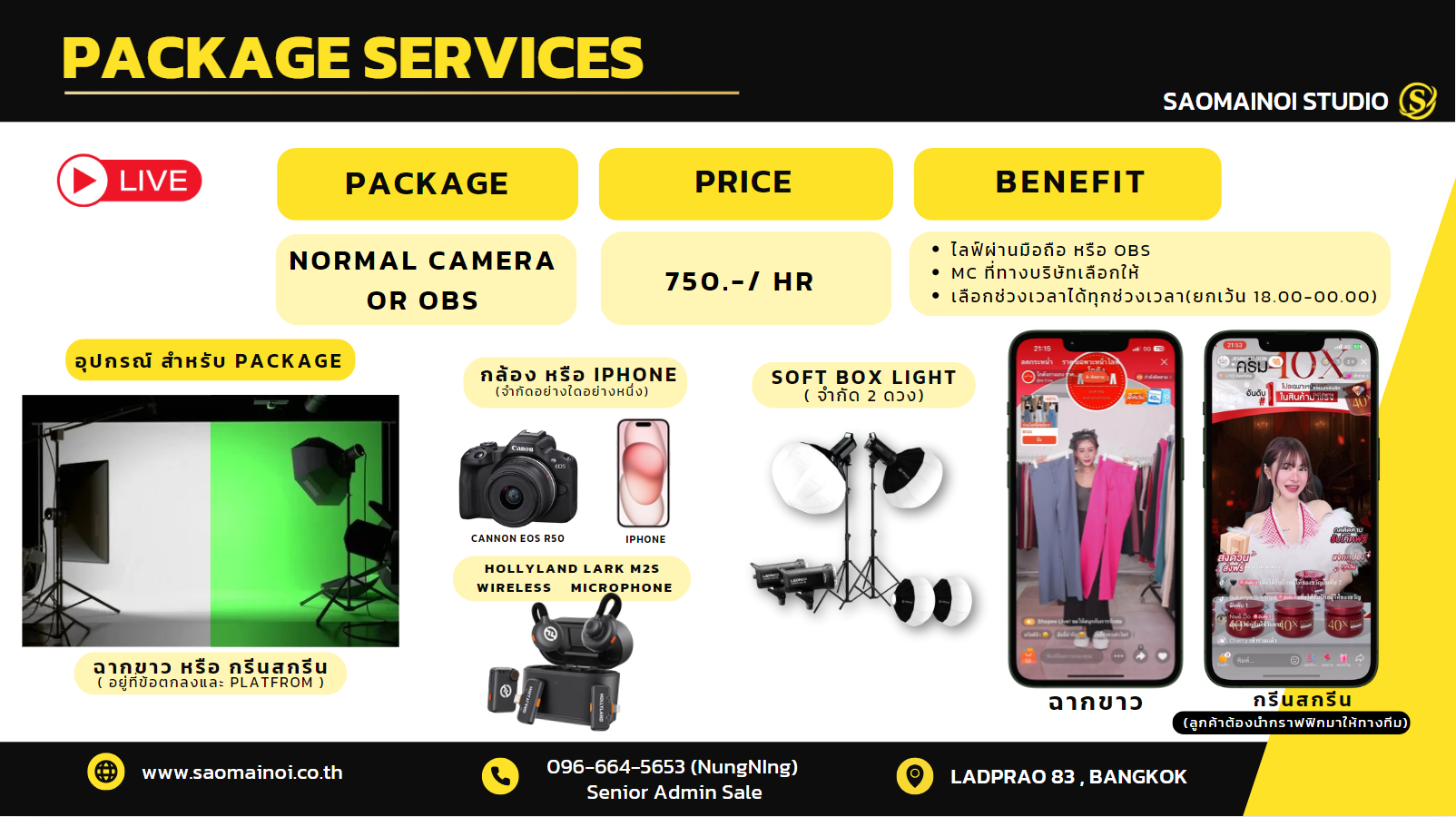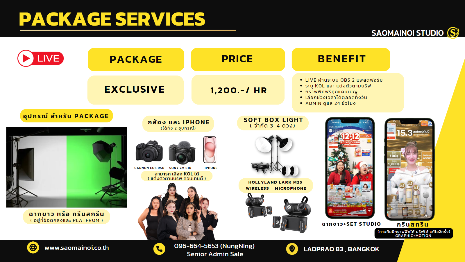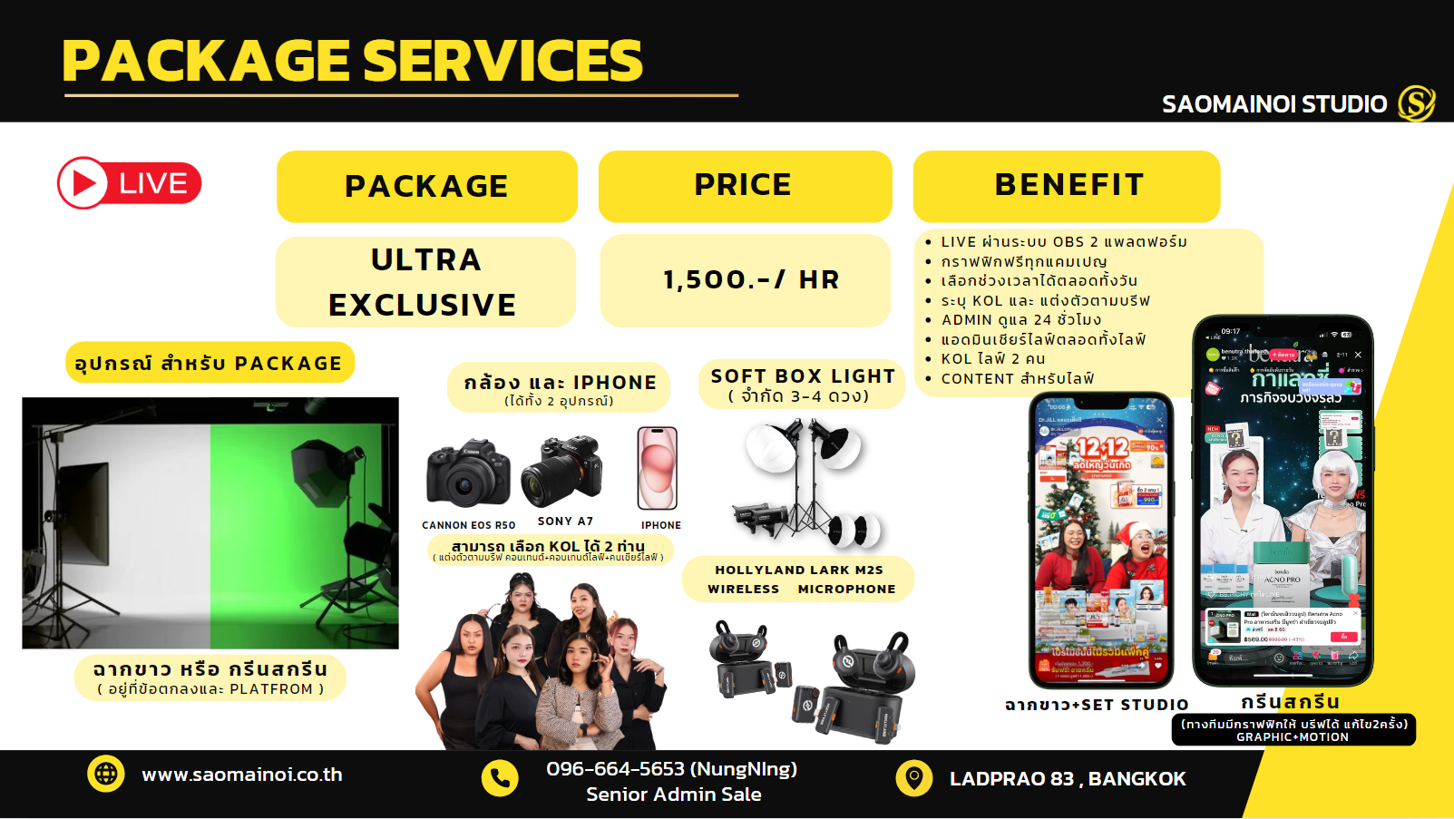 5.) หากเดินทางไปถ่ายทำนอกสถานที่ คิดค่าบริการเพิ่มเติม กิโลเมตรละ 30 บาท ขั้นต่ำ 1,000 บาท